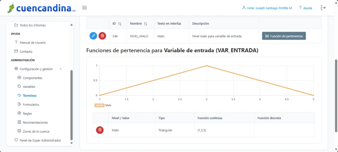 En el selector de variable lingüística, busca y elige la variable para la cual está asociado el término y su correspondiente función. Pulsa en el botón Función de pertenencia del término lingüístico de tu interés, en la última columna de la zona de trabajo central.