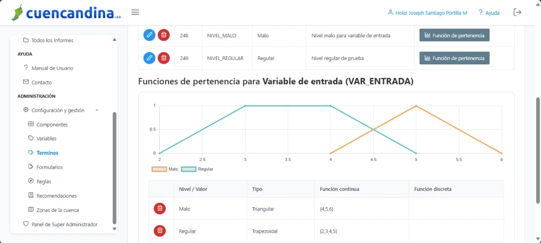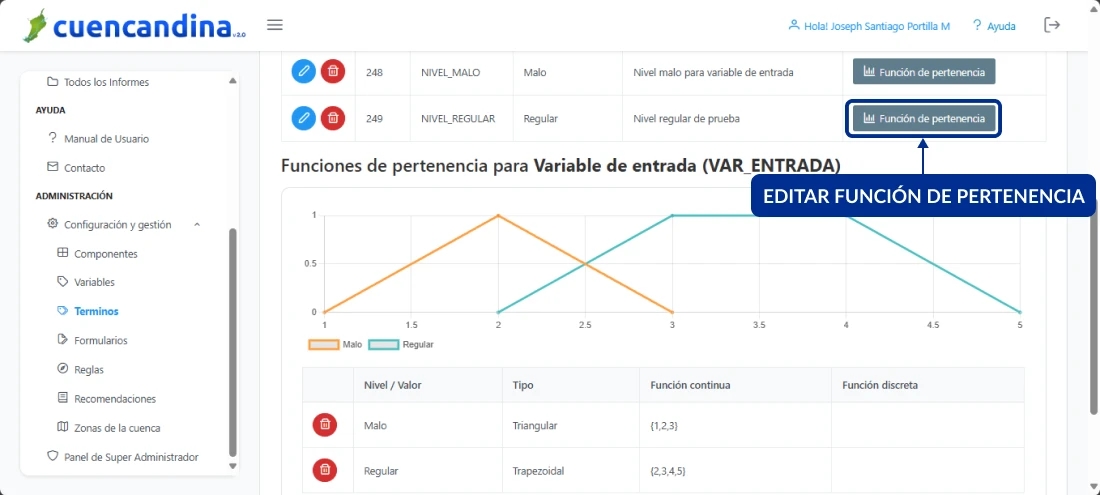 En el selector de variable lingüística, busca y elige la variable para la cual está asociado el término y su correspondiente función. Pulsa en el botón Función de pertenencia del término lingüístico de tu interés, en la última columna de la zona de trabajo central.