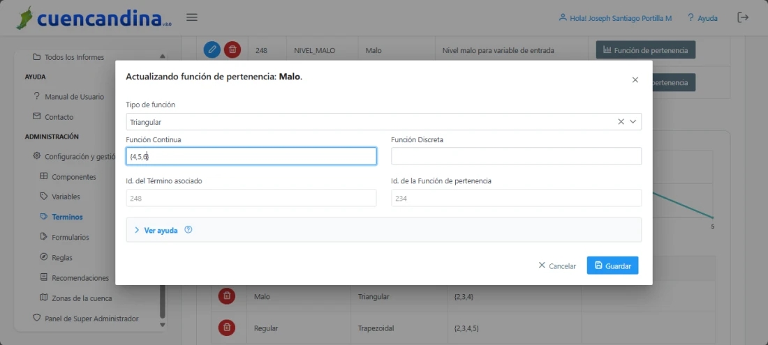 A continuación, se despliega una ventana emergente donde tendrás que ingresar la información de la función de pertenencia a editar para el término lingüístico seleccionado.