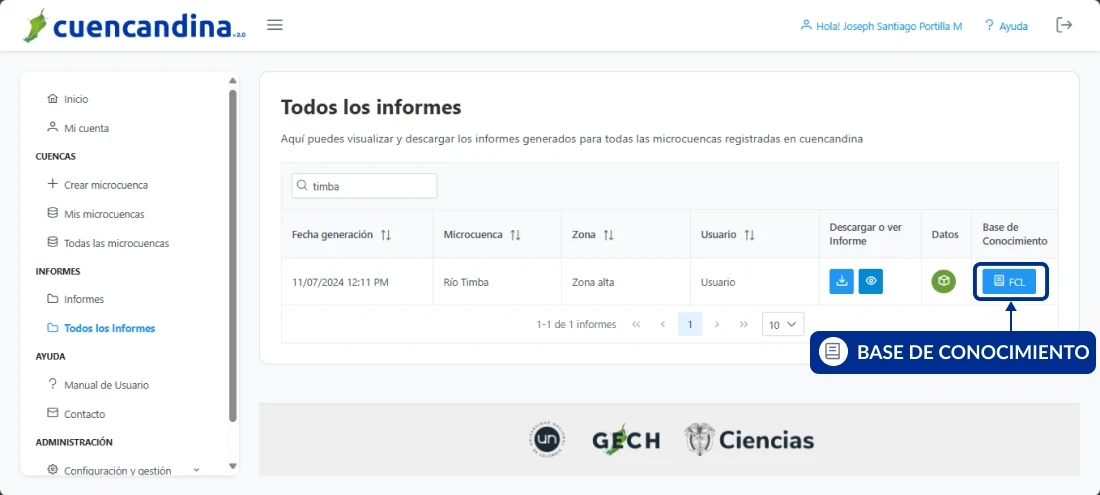 Busca y ubica el informe del cual deseas consultar su base de conocimiento, posteriormente pulsa el botón de FCL para visualizarla en una ventana emergente.