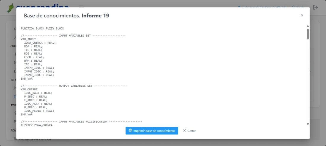 En la ventana se presenta el documento en formato FCL (Fuzzy Control Language) con las variables de entrada, salida, sus funciones de pertenencia y las reglas de decisión utilizadas en el proceso de lógica difusa.