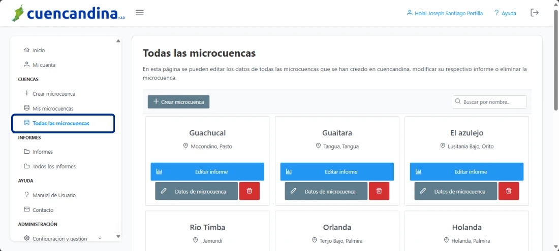 Los roles de administración pueden gestionar todas las microcuencas que se han creado en cuencandina, pudiendo modificar sus datos, editar sus componentes temáticos por zona, y eliminarla.