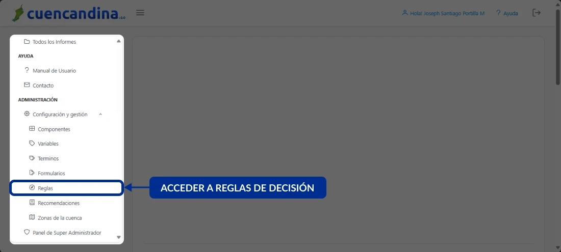 En la zona de trabajo central se listan las reglas de decisión asociadas a cuencandina. Éstas se pueden encontrar mediante el buscador integrado, digitando su nombre o texto en interfaz. Para facilitar la navegación se incluye un paginador con el fin de seccionar el contenido en páginas.