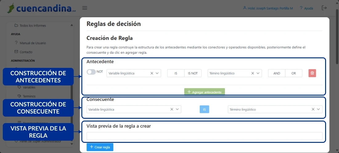 Mientras se construye la regla de decisión, cuencandina muestra la vista previa del texto de la regla en el área inferior.