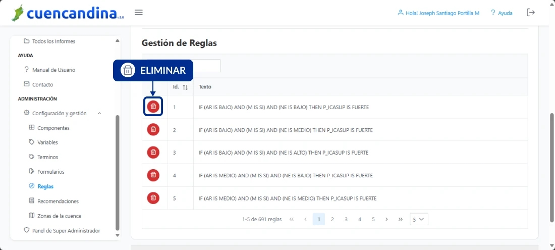Busca la regla que deseas eliminar. Pulsa en el botón Eliminar ubicado en la primera columna de la zona de trabajo central.