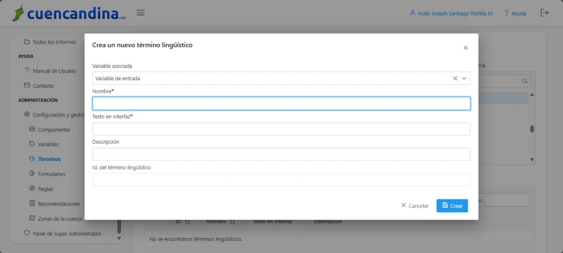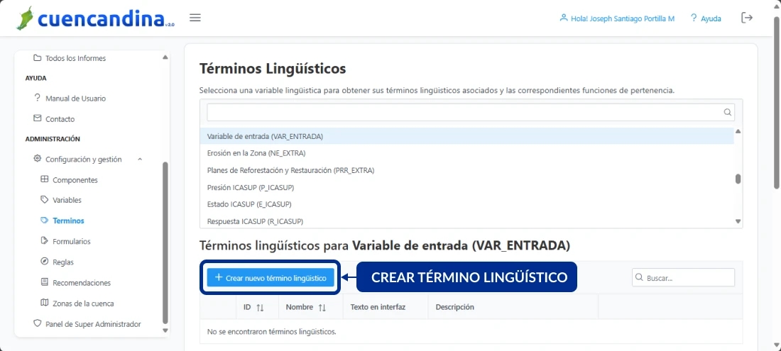Busca y selecciona la variable para la cual quieres crear el término. Pulsa el botón Crear nuevo término lingüístico ubicado en la zona de trabajo central