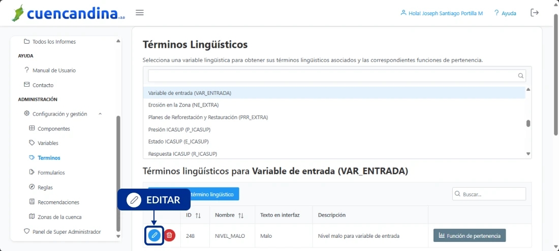 Busca y selecciona la variable para la cual quieres editar alguno de sus términos. Pulsa en el botón Editar ubicado en la primera columna de la zona de trabajo central.