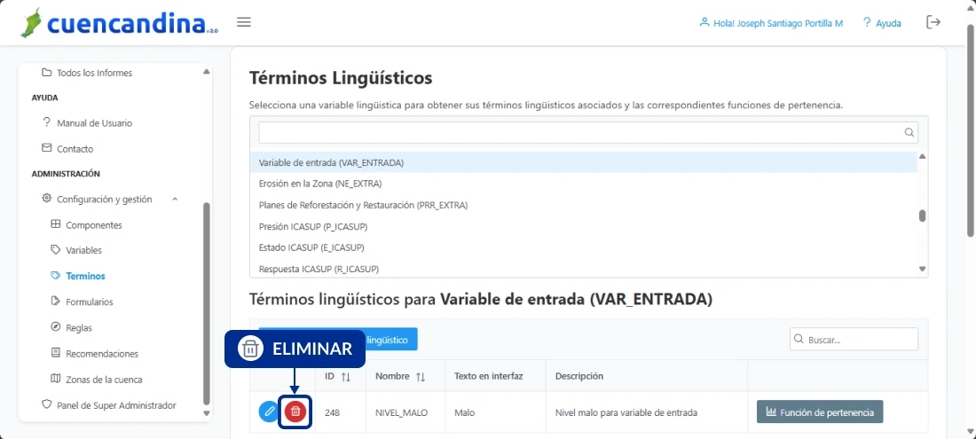 Busca y selecciona la variable para la cual quieres eliminar alguno de sus términos. Pulsa en el botón Eliminar ubicado en la primera columna de la zona de trabajo central.