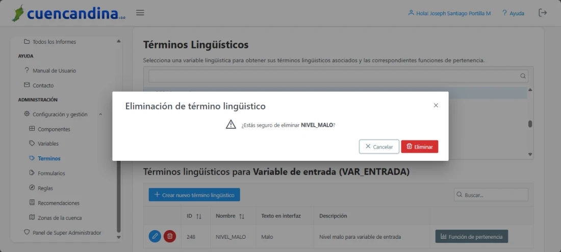 Suprimir un término lingüístico también eliminará todas sus funciones de pertenencia asociadas, y el sistema no podrá recuperarlas.