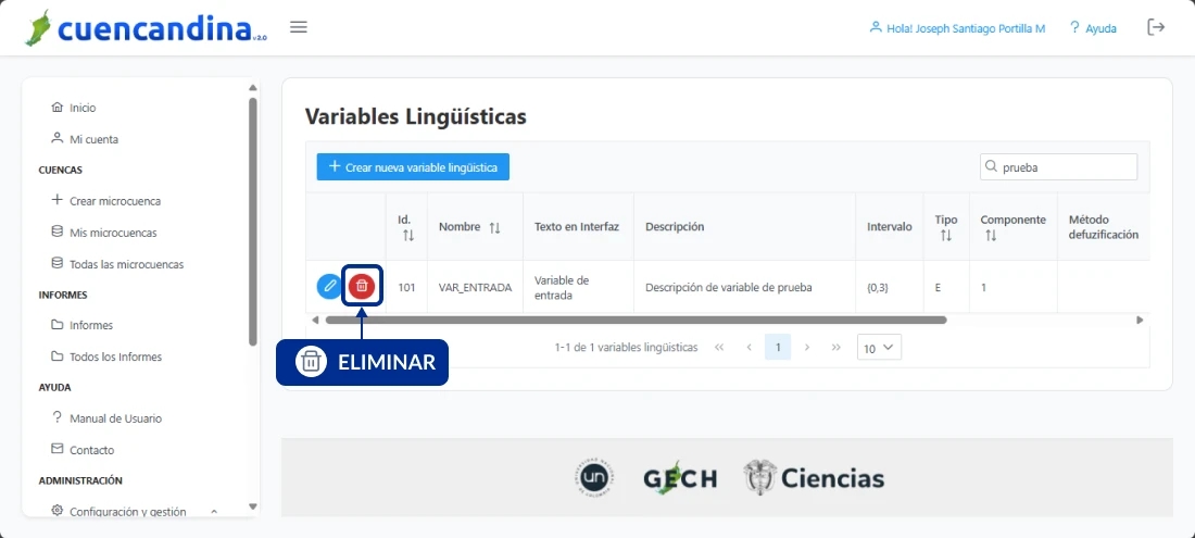 Busca la variable lingüística que deseas eliminar. Pulsa en el botón Eliminar ubicado en la primera columna de la zona de trabajo central.