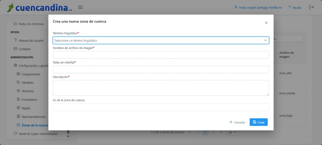 A continuación, se despliega una ventana emergente donde tendrás que ingresar la información de las propiedades de la zona de cuenca a crear