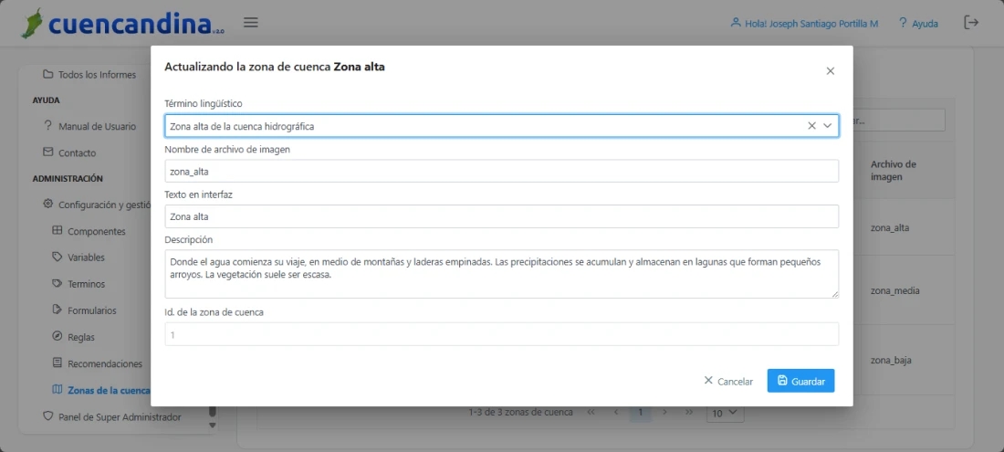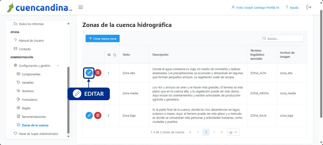 Busca la zona que deseas modificar. Pulsa en el botón Editar ubicado en la primera columna de la zona de trabajo central.