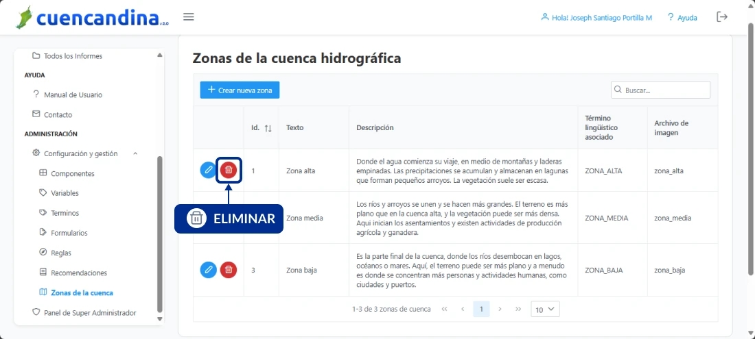 Busca la zona que deseas eliminar. Pulsa en el botón Eliminar ubicado en la primera columna de la zona de trabajo central.