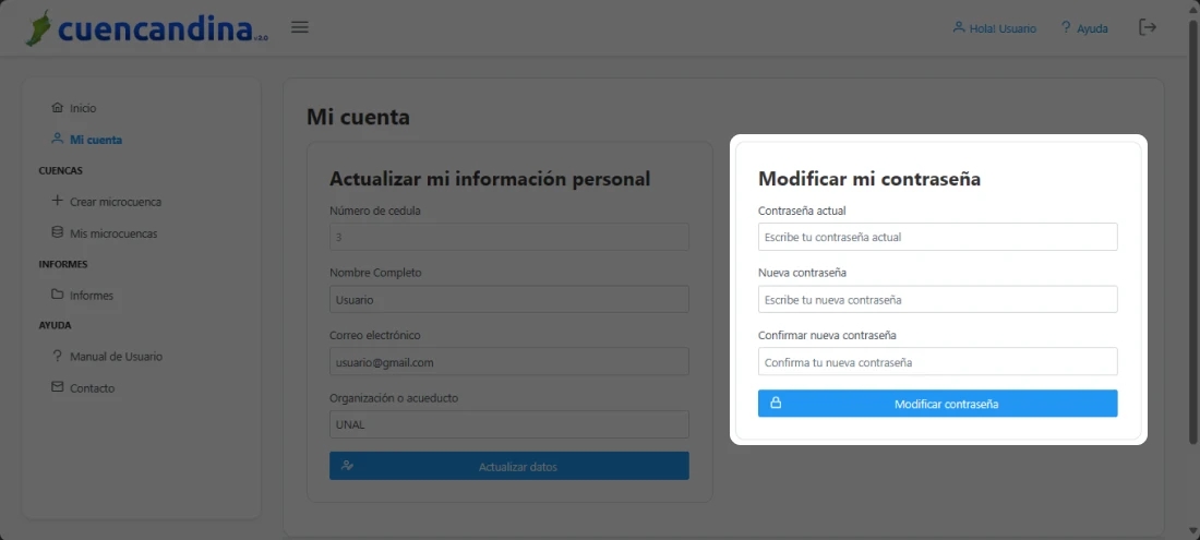 Dentro de la sección Modificar mi contraseña debes escribir primero tu contraseña actual para comprobar que eres el dueño de la cuenta, y a continuación digitar la nueva contraseña y su confirmación para validar que las has introducido de forma correcta.