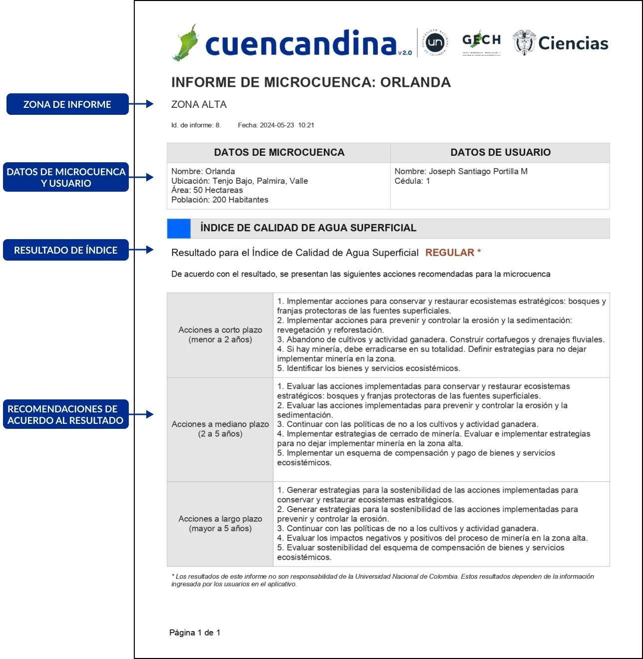 Cuencandina procesa los datos introducidos por los usuarios y mediante un modelo de inteligencia artificial produce informes para una zona específica de una microcuenca, brindando el estado de diversos índices y las recomendaciones de acuerdo a este resultado, estas recomendaciones contienen acciones a corto, mediano y largo plazo en la zona de la microcuenca.