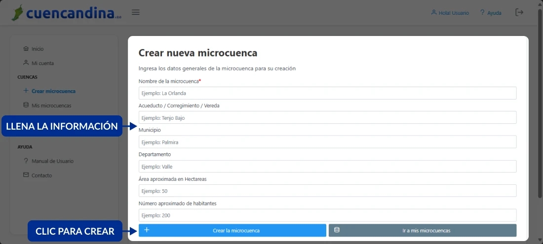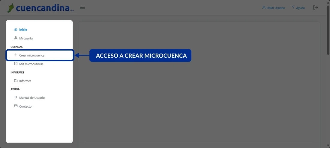 Accede a la opción de Crear microcuenca en el menú de navegación izquierdo.
