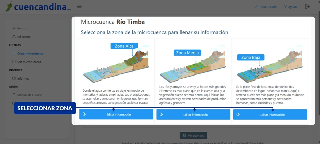 Tras haber creado la microcuenca, podrás elegir la zona para la cual vas a generar el informe inicial dando clic en el respectivo botón de editar información.
