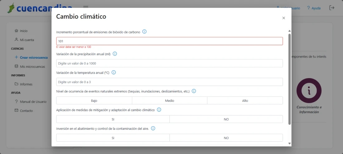 De esta forma puedes diligenciar la información de todos o alguno de los componentes de tu interés en la microcuenca, e ir almacenando las respuestas pulsando el botón de guardar. Después de realizar esto podrás generar el informe.