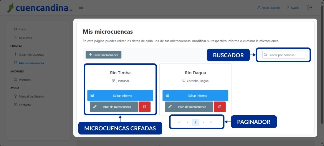 En la zona de trabajo central se listan las microcuencas creadas. Para facilitar la navegación se incluye un paginador con el fin de seccionarlas en páginas. Además, éstas se pueden encontrar mediante el buscador integrado, digitando su nombre o ubicación.